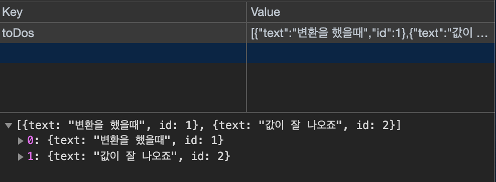 만약 아래와 같이 string인 localstorage value를 가져와 object로 변환하지 않고 js에서 사용하면 값은 출력되나, forEach문에서 오류가 발생하는 걸 볼 수 있다