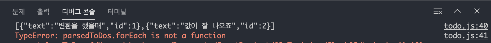 값은 이상 없이 console에 찍히는데 forEach문에서 오류가 나는 이유는 현재 parsedToDos 라는 변수는 object가 아닌 string이기 때문이다.