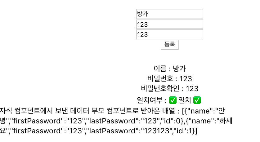 console.log(data) 자식 컴포넌트에서 보낸 data 부모 컴포넌트에서 값 확인 <span> 자식 컴포넌트에서 보낸 데이터 부모 컴포넌트로 받아온 배열 : {JSON.stringify(memberInfo)} </span>출력은 object인 memberInfo를 JSON.stringify() 메서드를 사용하여 문자열로 변환