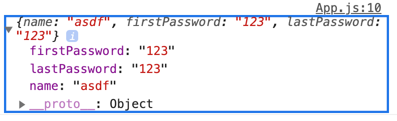 // 자식 컴포넌트에서 부모 컴포넌트로 값 보내기 handleSubmit = (e) => { const { name, firstPassword, lastPassword } = this.state; e.preventDefault(); this.props.onCreate({ name: name, firstPassword: firstPassword, lastPassword: lastPassword, }); this.setState({ name: '', firstPassword: '', lastPassword: '', checkPassword: '📝패스워드 입력📝', }); };기본적으로 submit 이벤트 발생시 페이지를 새로고침하기 때문에 이러한 것을 막아주기 위해 이벤트 발생시 e.preventDefault()를 사용해야한다. 그리고 this.props.onCreate를 사용하여 현재 입력받은 값을 부모 컴포넌트로 보내주도록한다. 이후 아래와 같이 부모 컴포넌트인 App.js에 handleCreate 메서드에서 자식 컴포넌트에서 보내온 데이터를 받아올 수 있게 된다.