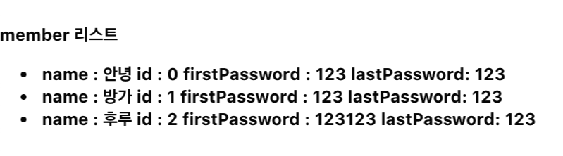 import React from 'react'; import MemberInfo from './MemberInfo'; const MemberInfoList = ({ memberData }) => { return ( <div> <div> <ul> {memberData.map((data) => ( <li key={data.id}> <MemberInfo name={data.name} key={data.id} id={data.id} firstPassword={data.firstPassword} lastPassword={data.lastPassword} /> </li> ))} </ul> </div> </div> ); }; export default MemberInfoList;전달받은 memberData배열을 map 메소드를 사용해서 멤버들의 전체 리스트를 출력하면 된다.