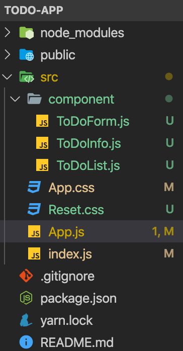 import React, { Component } from 'react'; import ToDoForm from './component/ToDoForm'; import ToDoList from './component/ToDoList'; import './App.css'; class App extends Component { id = 4; state = { toDoList: [ { id: 1, text: '러닝 뛰기', }, { id: 2, text: '공부하기', }, { id: 3, text: '독서하기', }, ], search: '', }; handleCreate = () => {}; handleUpdate = (id, data) => {}; handleRemove = (id) => {}; render() { const { toDoList } = this.state; return ( <div> <ToDoForm onCreate={this.handleCreate} /> <ToDoList data={toDoList} onUpdate={this.handleUpdate} onRemove={this.handleRemove} /> </div> ); } } export default App;ToDoForm 컴포넌트는 할일 목록을 입력받아 toDoList 배열에 추가할 props handleCreate를 전달한다.