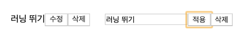 import React, { Component } from 'react'; class ToDoInfo extends Component { state = { toggle: false, text : '', style : { margin: '10px', }, }; handleChange = ( e ) => { this.setState({ [e.target.name]: e.target.value, }); }; handleToggleChange = () => { const { toggle, text } = this.state; const { data, onUpdate } = this.props; // false -> true if (!toggle) { this.setState({ text : data.text, toggle: true, }); } else { onUpdate(data.id, { text: text }); this.setState({ toggle: false, }); } // ture -> false }; handleRemove = () => {}; render() { const { data } = this.props; const { toggle, text } = this.state; console.log(data.text + ' 렌더링 됐어유'); return ( <div> {toggle ? ( <input style={this.state.style} onChange={this.handleChange} value={text} name="text" ></input> ) : ( <span style={this.state.style}>{data.text}</span> )} <button onClick={this.handleToggleChange}>{toggle ? '적용' : '수정'}</button> <button onClick={this.handleRemove}>삭제</button> </div> ); } } export default ToDoInfo;toggle 을 만들어 false와 true일 때 handleToggleChange 메소드를 이용하여 각각에 맞는 이벤트들을 처리하도록 했습니다.