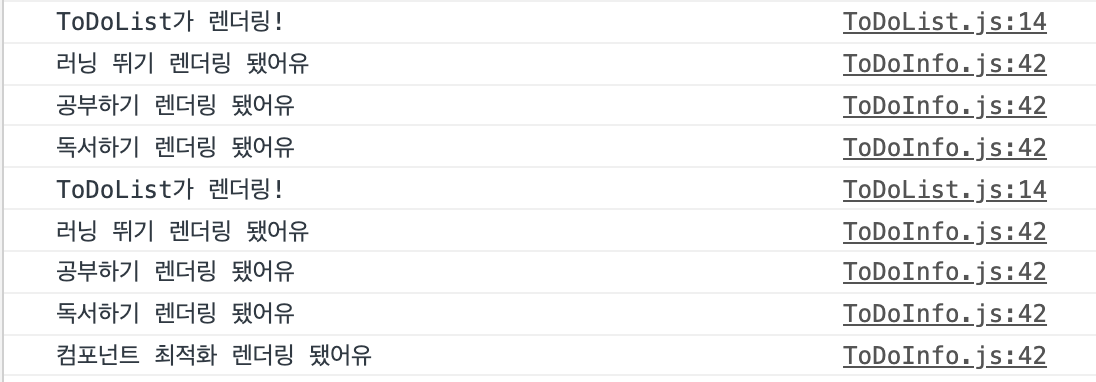 컴포넌트 최적화 추가후 console창 하나의 todo를 추가 했는데 기존에 있던 것 까지해서 총 4번의 렌더링이 됩니다.