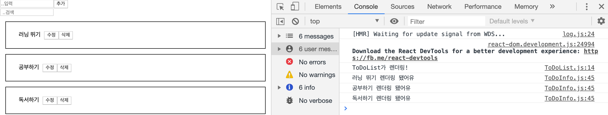 render() { const { data } = this.props; const { toggle, text } = this.state; console.log(data.text + ' 렌더링 됐어유'); return ( <div> {toggle ? ( <input style={this.state.style} onChange={this.handleChange} value={text} name="text" ></input> ) : ( <span style={this.state.style}>{data.text}</span> )} <button onClick={this.handleToggleChange}>{toggle ? '적용' : '수정'}</button> <button onClick={this.handleRemove}>삭제</button> </div> ); }TodoInfo 컴포넌트가 렌더링 될 때를 알기 위해 console.log 추가